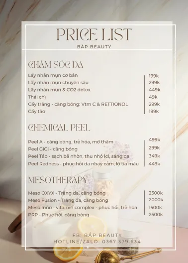 Bắp Beauty Spa – Đánh thức vẻ đẹp tự nhiên! Tọa lạc trong không gian ấm cúng và hiện đại, Bắp Beauty Spa là điểm đến lý tưởng dành cho những ai yêu thích chăm sóc sắc đẹp và thư giãn. Với đội ngũ kỹ thuật viên tận tâm, giàu kinh nghiệm cùng công nghệ làm đẹp tiên tiến, Bắp Beauty Spa mang đến các dịch vụ đa dạng.
